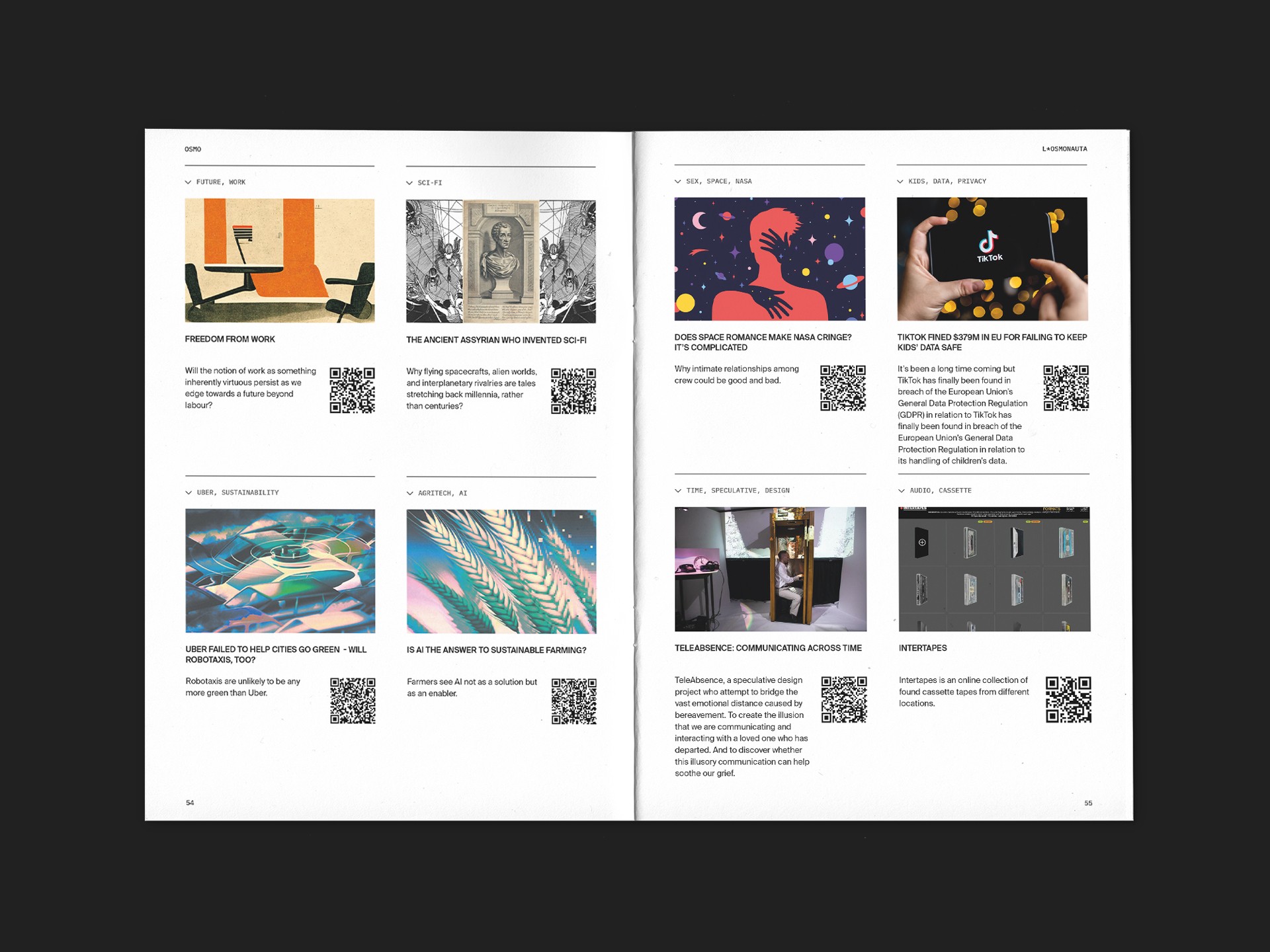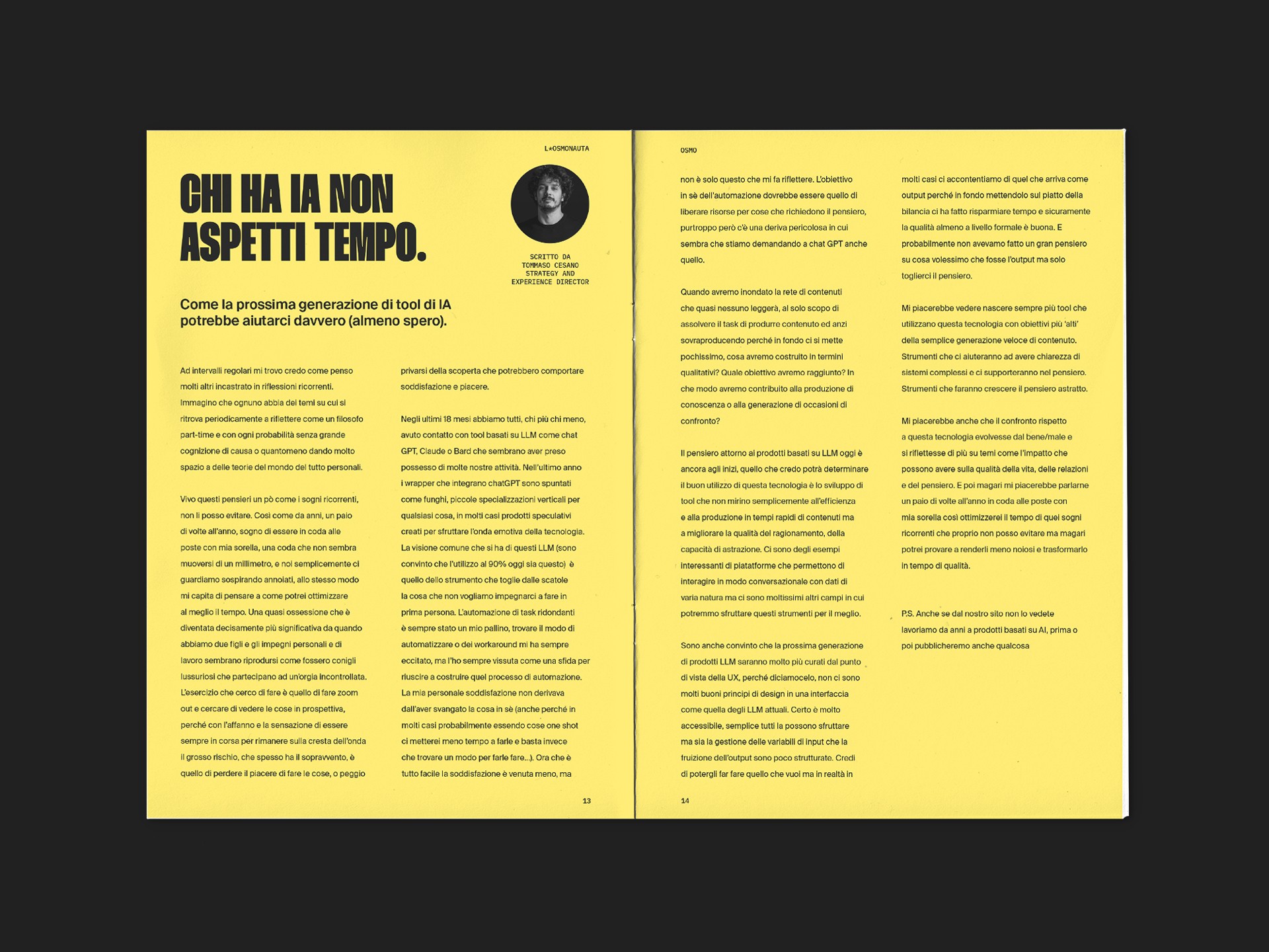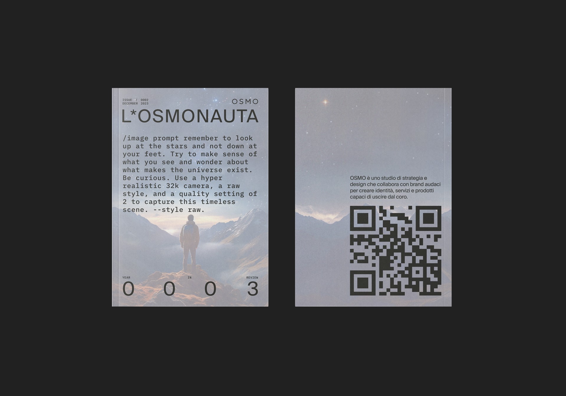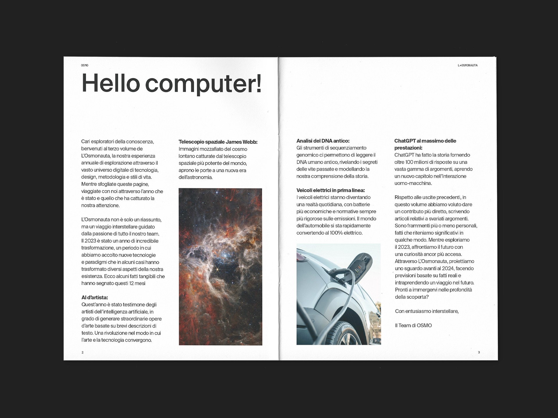 Dear explorers of knowledge, welcome to the third volume of L*OSMONAUTA, our annual journey through the vast digital universe of technology, design, methodology, and lifestyles. As you turn these pages, travel with us through the year that was and the moments that captured our attention. L*OSMONAUTA is not just a summary but an interstellar voyage driven by the passion of our entire team. 2023 has been a year of incredible transformation, a time when we embraced new technologies and paradigms that, in some cases, have reshaped various aspects of our lives. Compared to previous editions, in this volume we aimed to offer a more direct contribution by writing articles on a variety of topics. These are fragments that are more or less personal, events we consider significant in some way. As we navigate through 2023, we approach the future with an even greater sense of curiosity. Through L’OSMONAUTA, we cast our gaze towards 2024, making predictions grounded in real events and embarking on a journey into the future. Ready to dive into the depths of discovery?