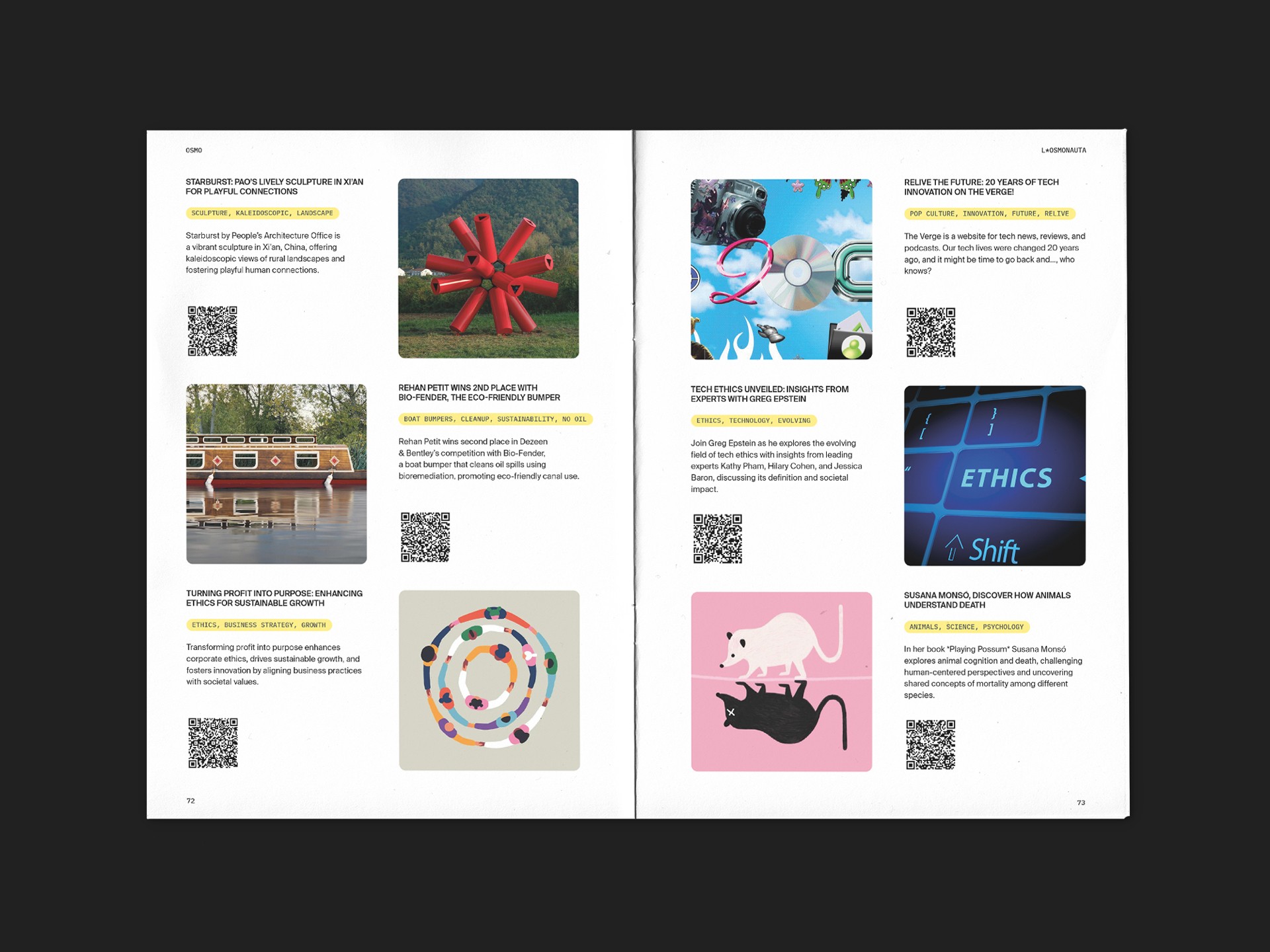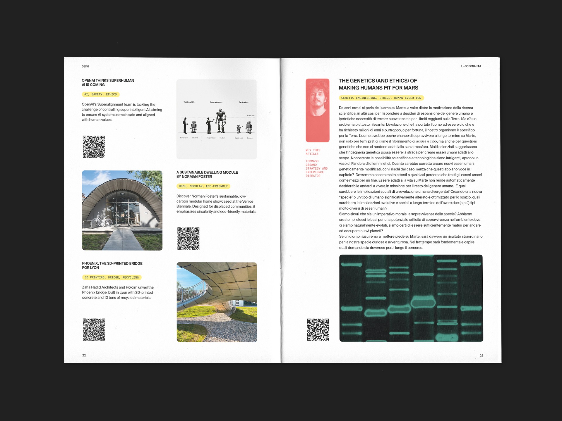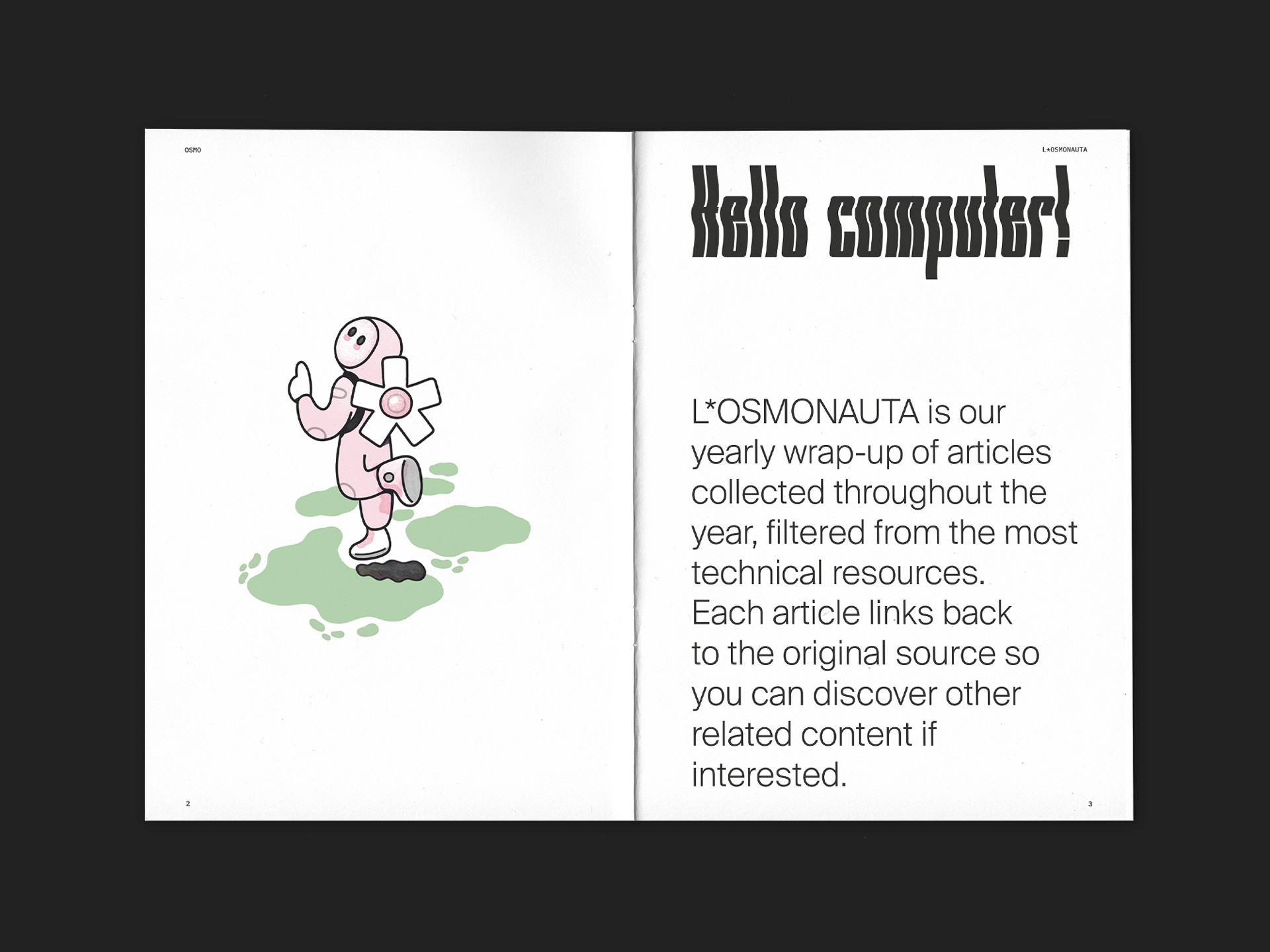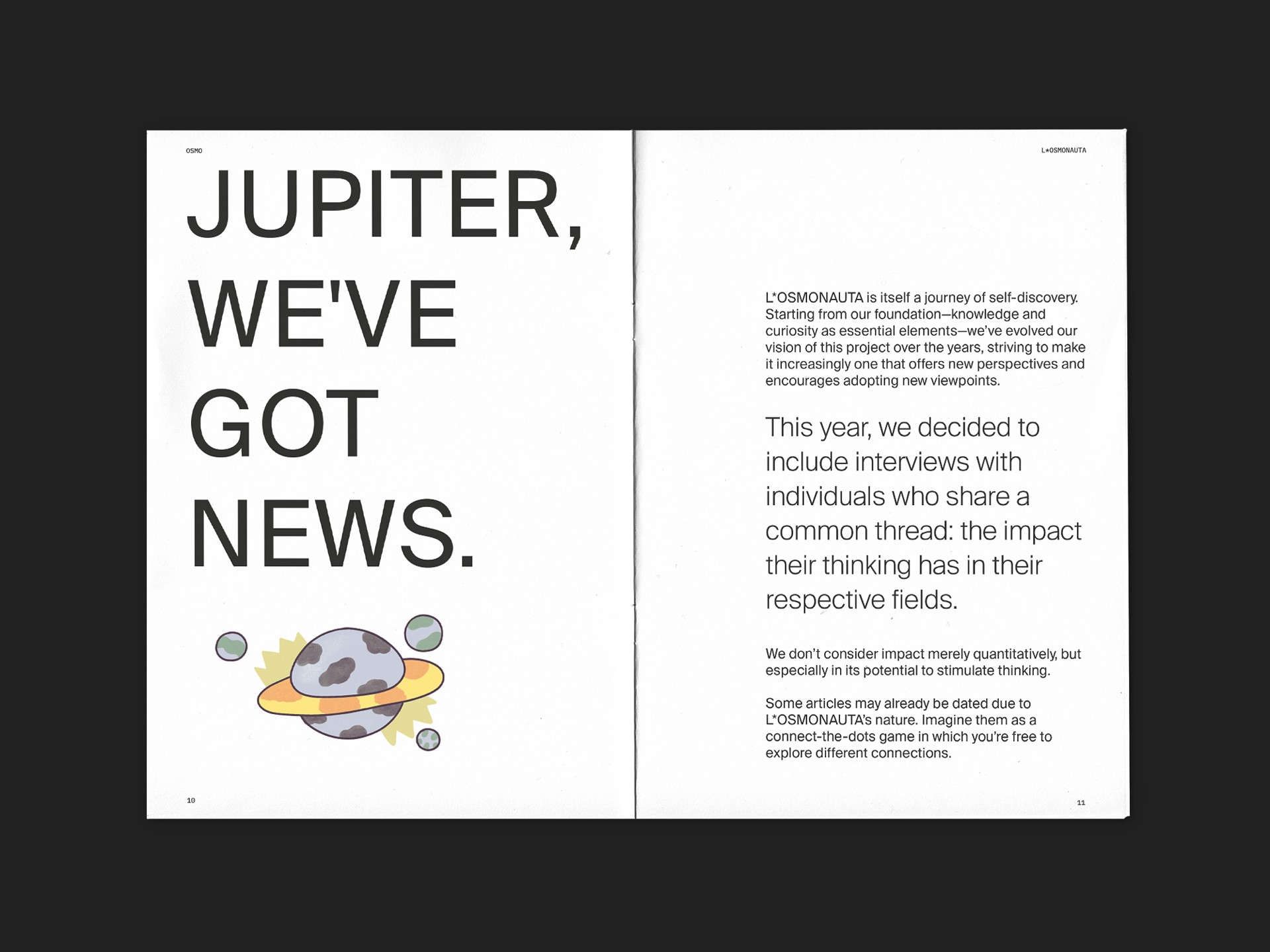 L*OSMONAUTA is itself a journey of self-discovery. Starting from our foundation—knowledge and curiosity as essential elements—we’ve evolved our vision of this project over the years, striving to make it increasingly one that offers new perspectives and encourages adopting new viewpoints. This year, we decided to include interviews with individuals who share a common thread: the impact their thinking has in their respective fields. We don’t consider impact merely quantitatively, but especially in its potential to stimulate thinking. Some articles may already be dated due to L*OSMONAUTA’s nature. Imagine them as a connect-the-dots game in which you’re free to explore different connections. The four interviews you’ll find this year are meant to provide additional insights and, in some cases, perspectives that might help you connect these dots in new and different ways. We hope this applies not only to the dots you’ll find in L*OSMONAUTA but to all those you’ll encounter in the future. We enthusiastically welcome these new travel companions, thanking them for helping spark new reflections and inspirations in us—and hopefully in you too. Beyond these interviews, you’ll find a few articles accompanied by our perspective on why we find them interesting. Not with the intent that this becomes your interpretation, but to make more intelligible the reasons that led us to select all the others, giving you hints of how the studio’s internal culture has dynamically and collaboratively generated this body of knowledge over the last 12 months. We believe that value doesn’t always lie in the content itself, but in the process that led us to consider it relevant at a certain moment and context. Happy exploring and discovering.
